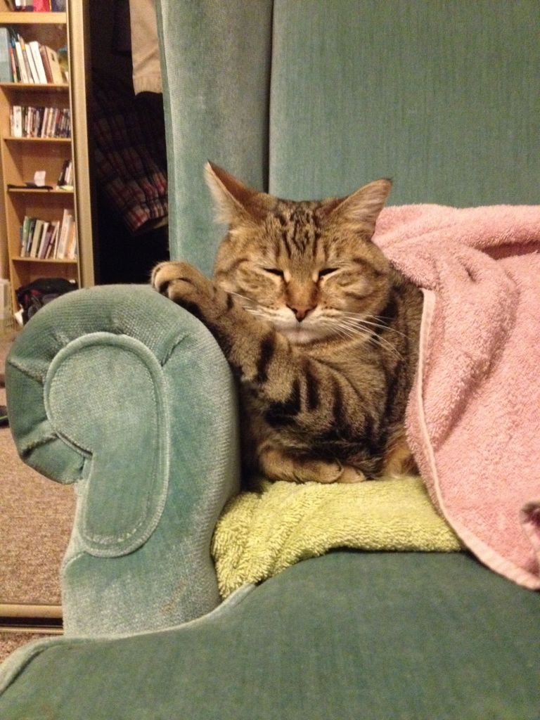 Duchess naps on wingback chair in my bedroom in Sugar House,UT 2014